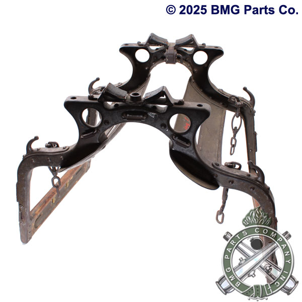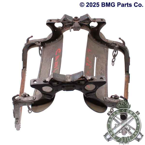 Pack Saddle, Mule or Horse, Machine Gun. With four adjustable tie down hardware, 10 D-Rings and 4 Rope Hooks (Cleats), for securing to the mule or horse. Leather pads, wood and metal frame are in excellent condition. Vintage Surplus.